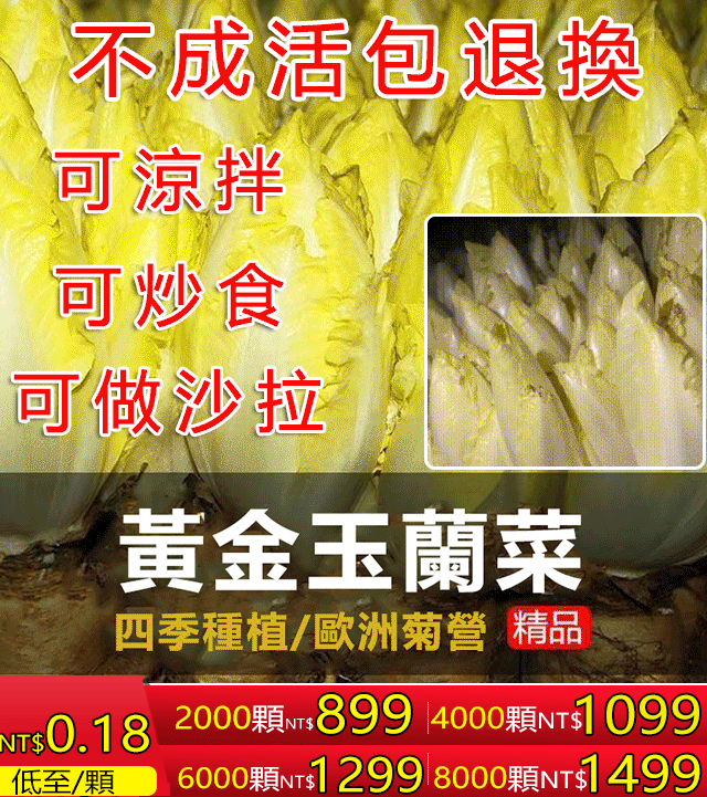 4分鐘前清脆可口的【黃金玉蘭菜】居然這麼簡單就可以種出來!生吃脆香甜,炒肉比肉鮮,輕輕鬆鬆幾個月就可以收穫,關鍵是年年可以割,年年可以長,年年有的吃 - 特大優惠!比利時「金玉蘭種子」4000顆(送狀根肥料)87%用戶的選擇!NT$1099
